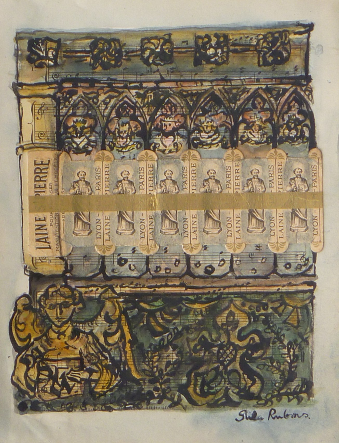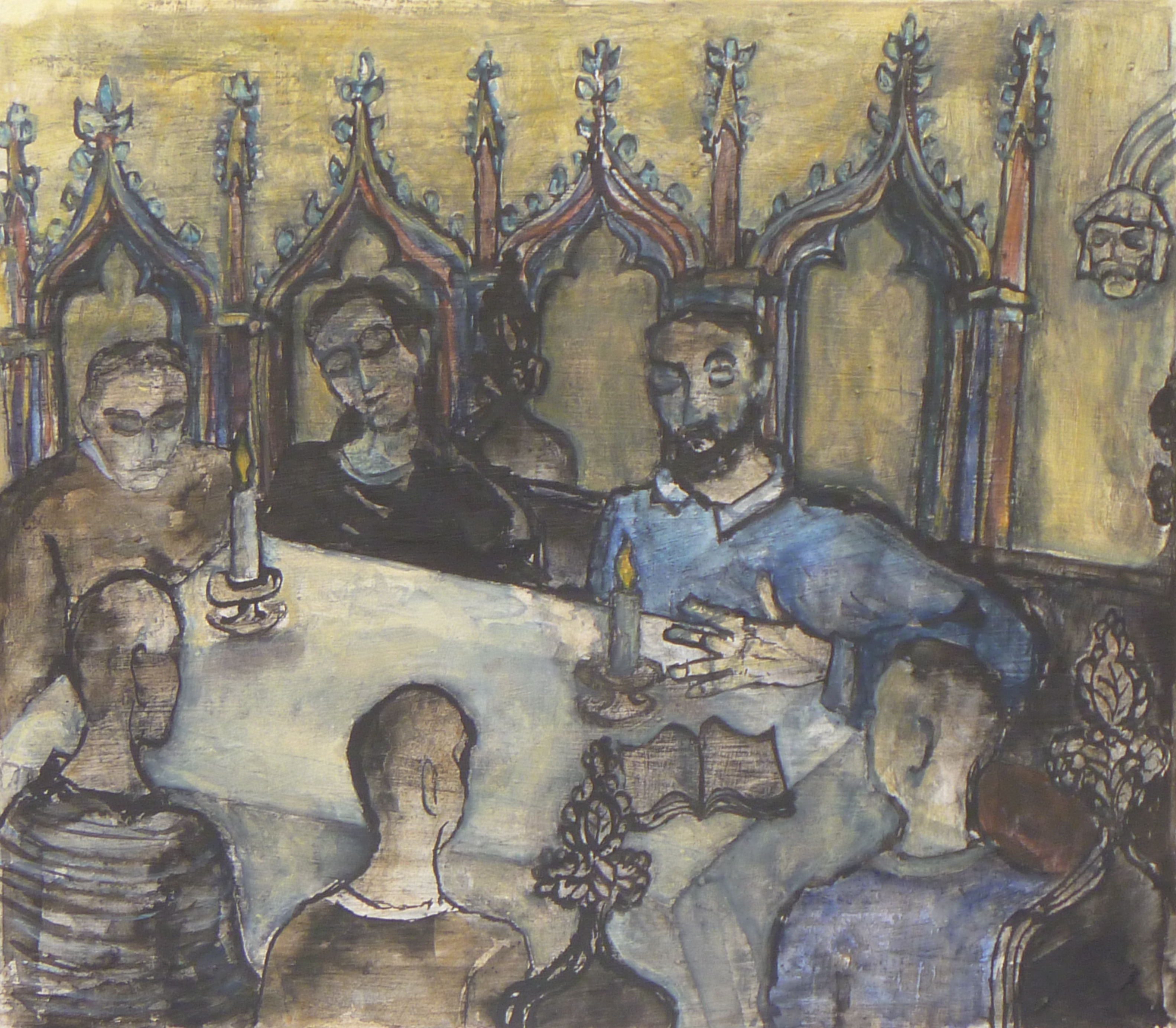 She researched stories of Michaelhouse past and present, and immersed herself in the everyday life of the building, uncovering a distinctive human culture of worship, hospitality and culture. Her drawings, paintings and collages depict many of the architectural features of St. Michael’s church and the activities that take place throughout the building (recitals, communion services, choir practices, meetings and concerts.