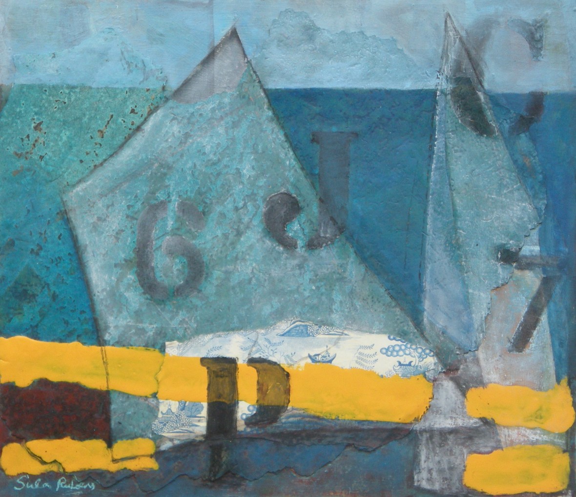 SEA ROAD I collage, Hammerite, acrylic, pastel on paper